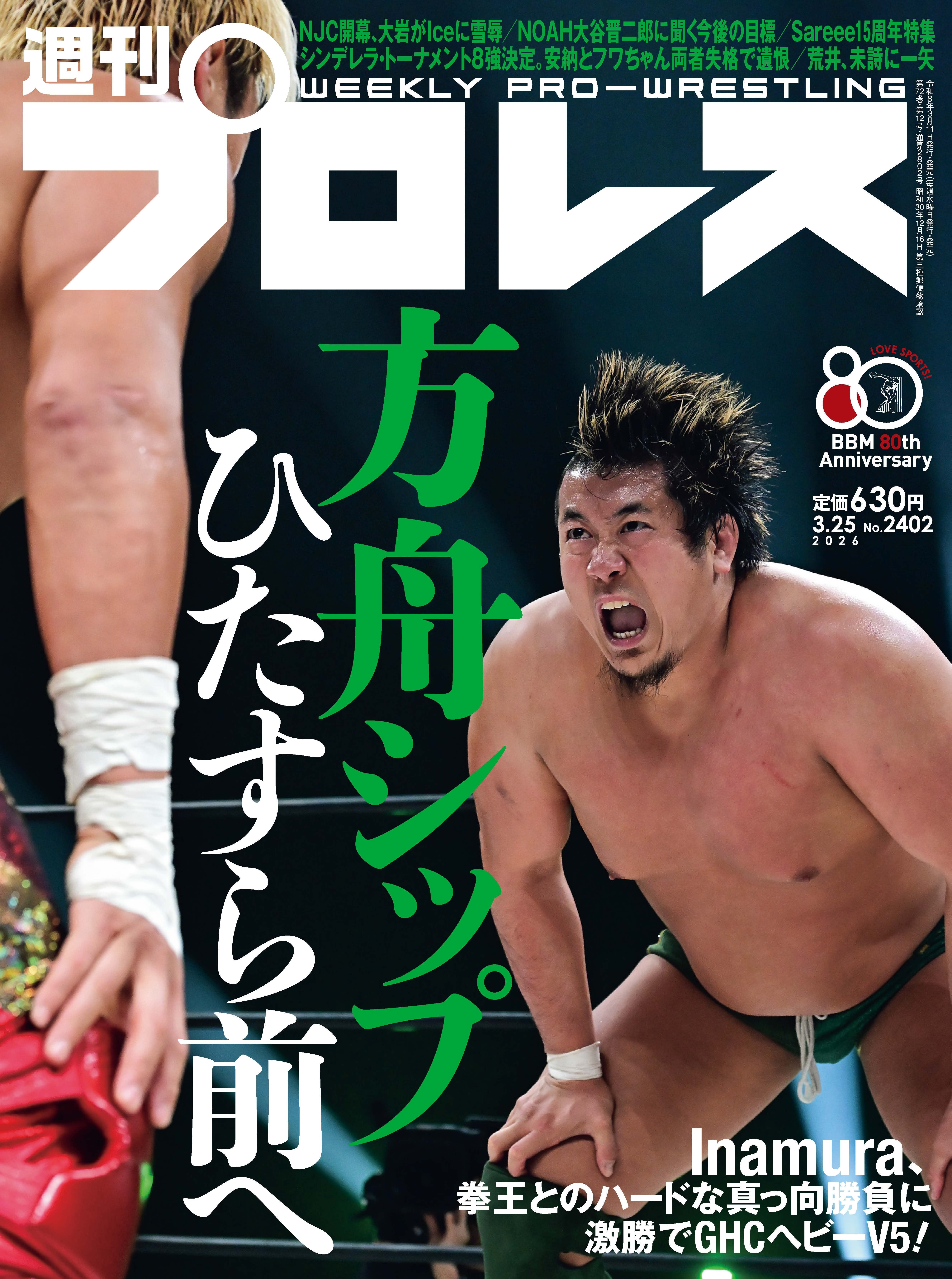 今週号の表紙はNOAH横浜武道館でGHCヘビーV5に成功したYoshiki Inamuraです。待望の挑戦者・拳王とのハードな真っ向勝負はNOAHの頂上決戦にふさわしい大熱戦。ほかにもGHCジュニア2大タイトルマッチなど注目カード中心に詳報。