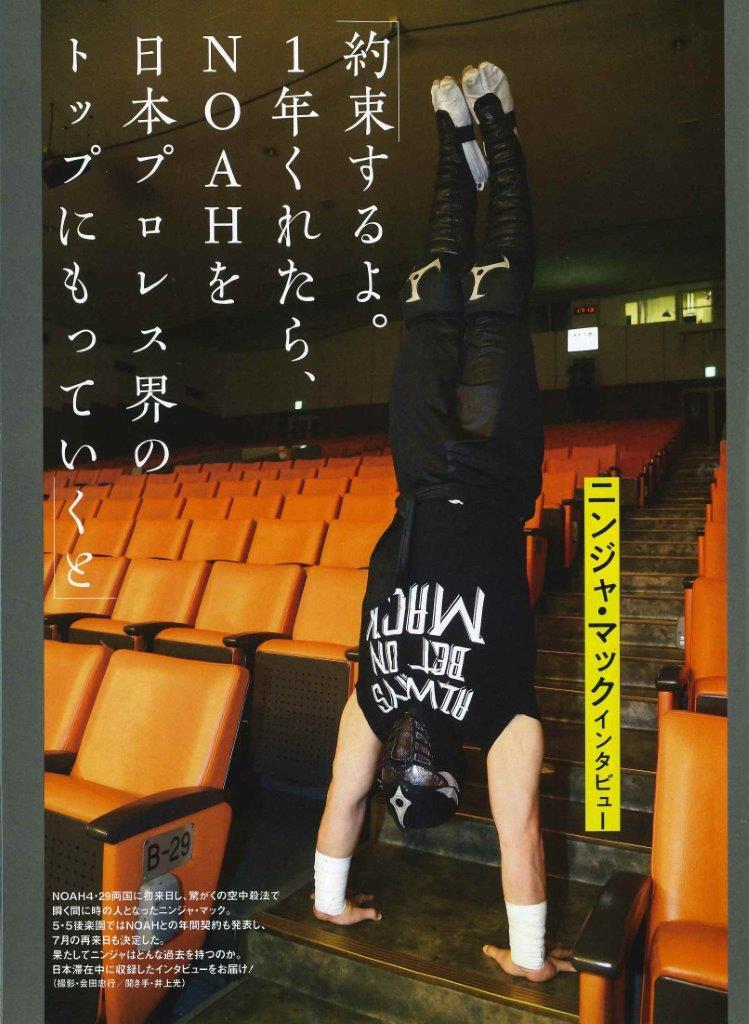 今週号の表紙はNOAHがこの秋、初進出する有明アリーナを視察したGHCヘビー級王者・潮崎豪です。巻頭カラーでは大田区ビッグマッチを詳報。GHCヘビー前哨戦で潮崎が挑戦者・小島聡をラリアットで下し、メインで復帰戦を闘った武藤敬司は試合後に意味深発言、GHCタッグはエルガン&北宮が一発奪取するなど話題豊富。NOAH関連はニンジャ・マックのインタビューほかピンナップもスティンガーとニンジャ!