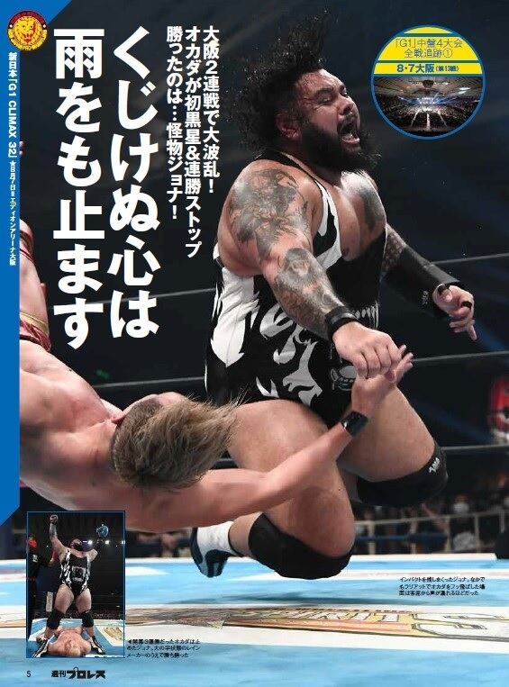 今週号の表紙は新日本「G1 CLIMAX」大阪大会初日でウィル・オスプレイから2年ぶりの勝利をあげて優勝戦線に生き残った鷹木信悟です。中盤にさしかかったG1は4大会を全戦追跡。オカダがジョナに敗れて初黒星を喫したほか、ジェイvsオーカーン、ジョナvsコブなど注目リーグ戦を中心に巻頭カラーから詳報します。