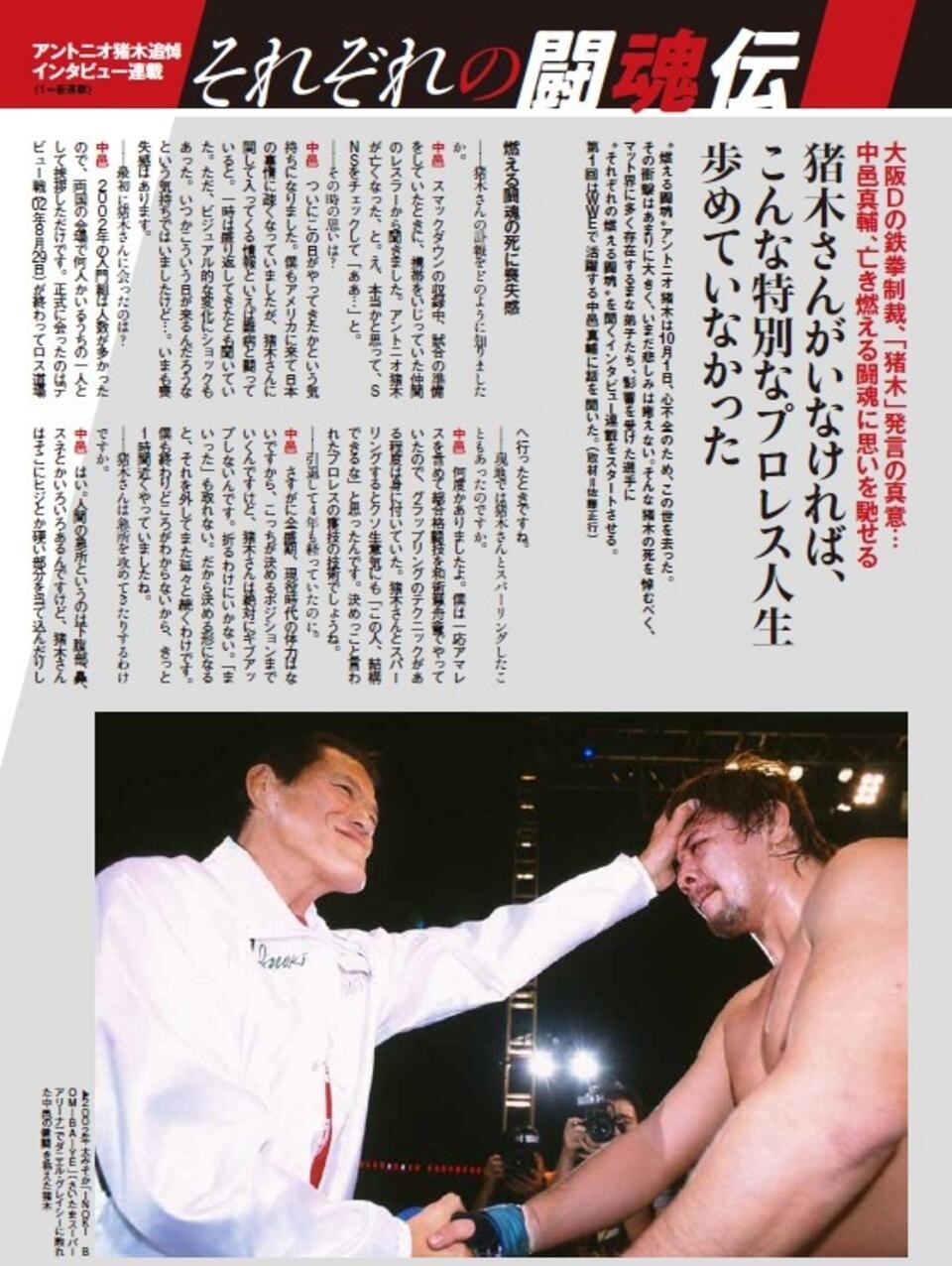 今週号から緊急連載としてアントニオ猪木さんへ追悼の意を込めて、縁の深い選手にインタビューする「それぞれの闘魂伝」をスタート。初回は現在WWEで活躍する中邑真輔に話を聞いています。猪木さんが新日本のオーナー時代、総合格闘技の試合に参戦した当時の話など思い出を語ります。