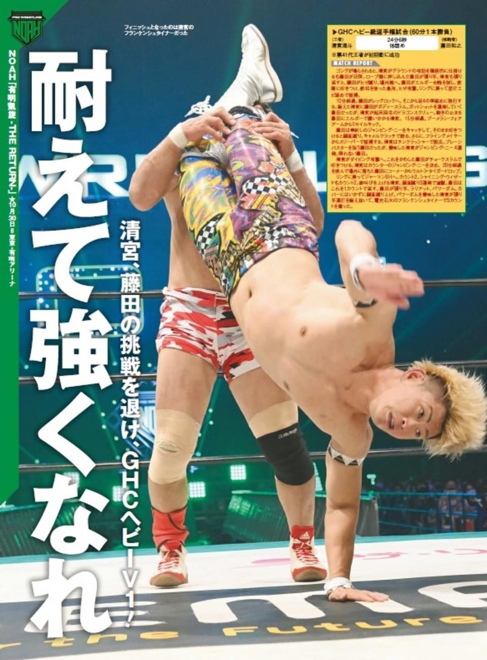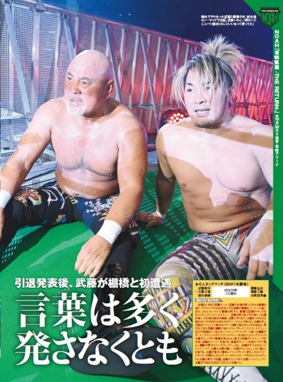 今週号の表紙はNOAH有明アリーナ大会、引退ロードで愛弟子の棚橋弘至と闘う武藤敬司です。同大会はNOAHが久々に有明の地に帰還。GHCヘビーは清宮が藤田を下して初防衛成功のほか、タイトルマッチ中心に巻頭カラーから詳報します。