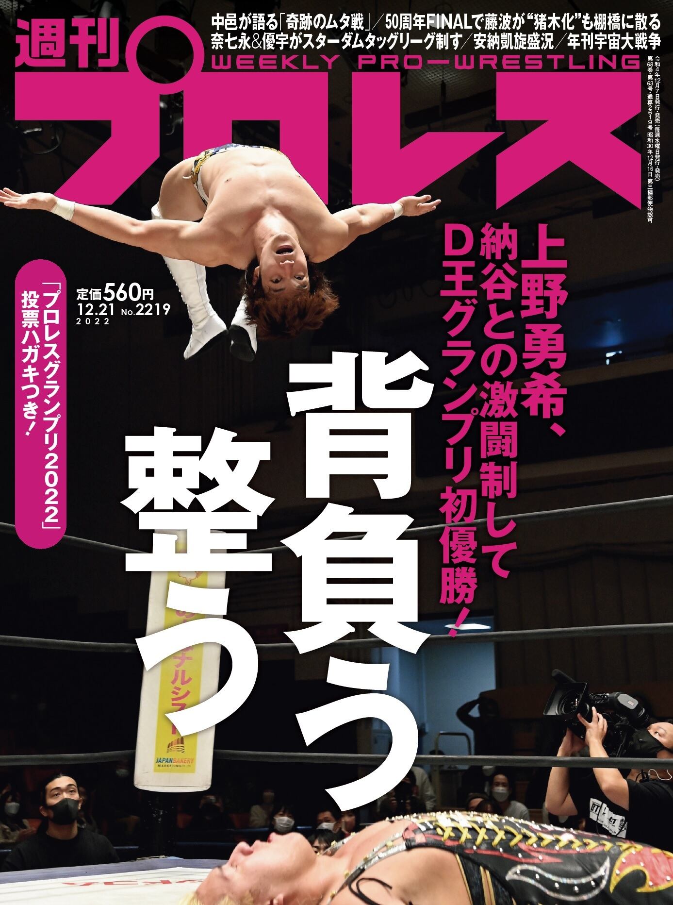 今週号の表紙はDDT後楽園大会で「D王グランプリ」初優勝を果たした上野勇希です。昨年に続いて2年連続決勝進出。納谷幸男との激闘を制した上野がついにDDTの頂点に立った試合を中心にリポート。