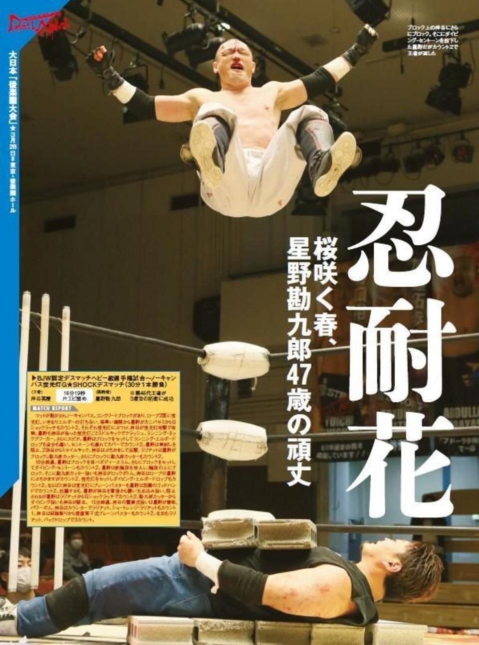 新日本は新シリーズ開幕。国内はKOPW戦、鷹木vsヘナーレがおこなわれた後楽園大会を詳報。それだけでなく柴田勝頼が復帰以来初の王座奪取するなど、アメリカ各地で新日本の選手がリングに上がった試合もまとめて掲載。また、IWGPタッグ王者の後藤洋央紀&YOSHI-HASHIの毘沙門にもインタビュー。