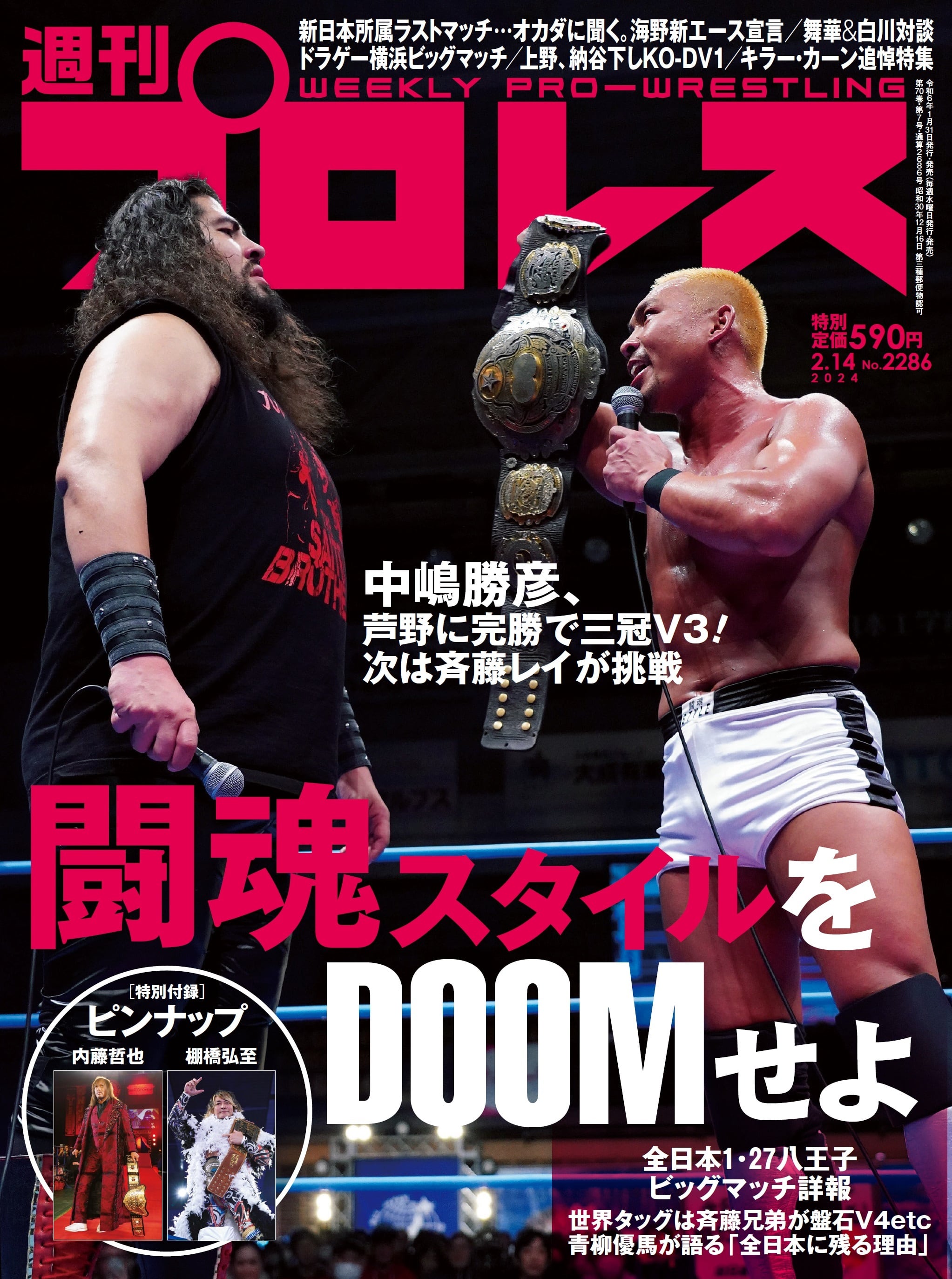 今週号の表紙は全日本今年最初のビッグマッチとなる八王子大会で芦野祥太郎を破り三冠王座V3達成した中嶋勝彦と次期挑戦者の斉藤レイです。同大会では世界タッグ王者の斉藤兄弟がV4達成したほかにも青柳vs竹下のタッグ対決、世界ジュニア戦、石川&めんそーれの所属ラストマッチなど注目カード目白押し。巻末言では青柳優馬が混乱の全日本に残った理由などを語っているので必読。