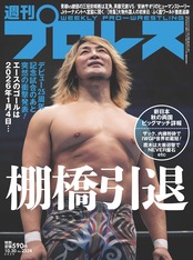 今週号の表紙は新日本、秋の両国ビッグマッチで衝撃の引退発表をした棚橋弘至です。NEVER6人タッグ王座防衛を果たした直後の棚橋がリング上から衝撃発言。メインはザック・セイバーJrが内藤哲也を下してIWGP世界ヘビー初戴冠。注目カード中心に詳報。