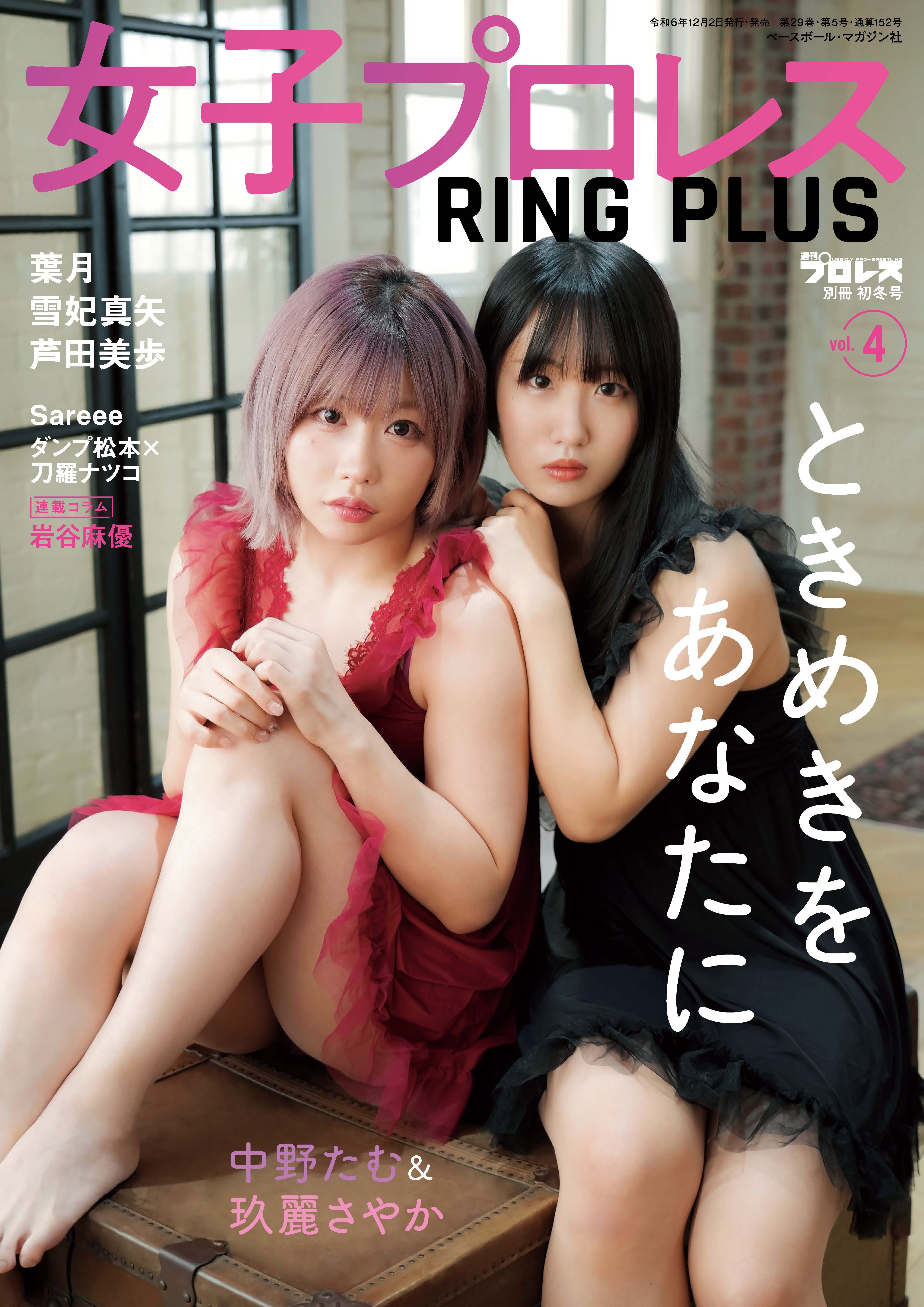 グラビア特化の隔月女子プロレス誌「女子プロレスRING PLUS vol.4」(週刊プロレス別冊初冬号)がベースボール・マガジン社より12月2日(月)発売。オールカラー84ページ、A4版、定価1300円(税込み)。
